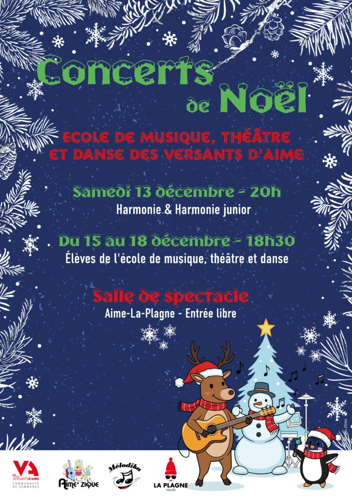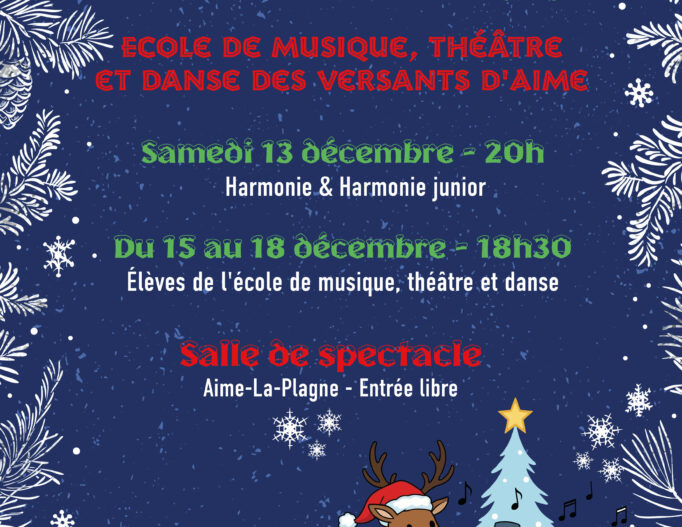 A l’approche des fêtes de Noël, l’Harmonie Aime’Zique et l’École de musique, théâtre et danse des Versants d’Aime vous proposent une série de concerts à la salle de spectacle d’Aime-La-Plagne: