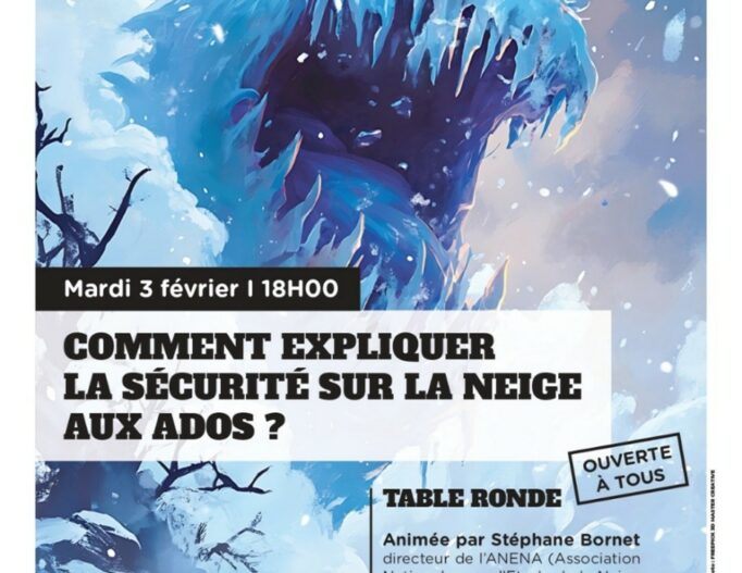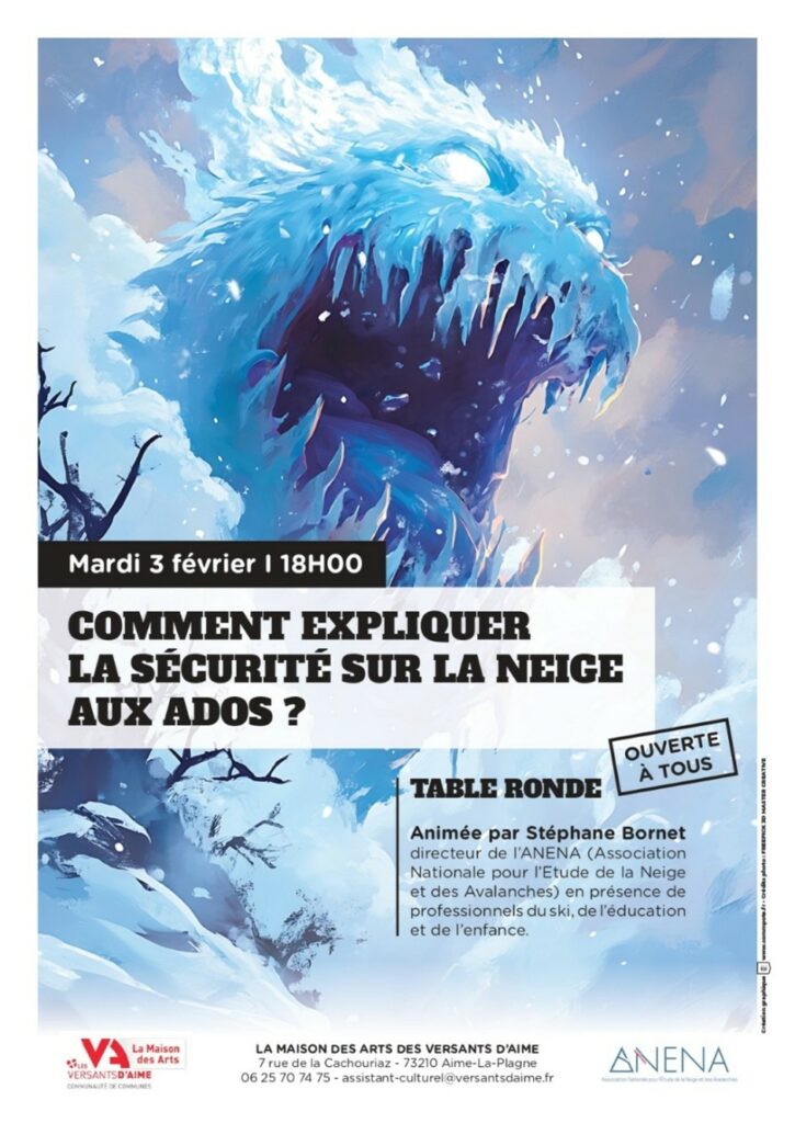 En marge de l’exposition « Entre Neige et Lumière », la Maison des arts des Versants d’Aime organise le mardi 3 février à 18h, une table ronde sur les enjeux de la sensibilisation des adolescents aux risques et à la sécurité en montagne en hiver.